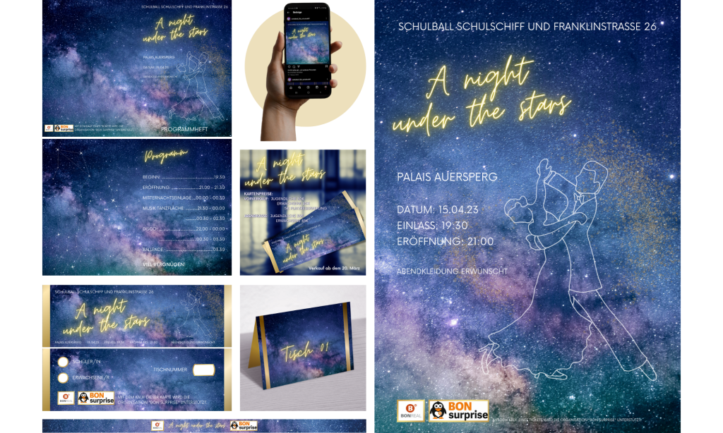 Die folgenden Gebrauchsgrafiken (doppelseitig bedruckte Eintrittskarten, Armbänder für Besucher, Programmhefte sowie Tischkarten, zudem noch ein Plakat sowie zwei Bilder für Instagram Posts) habe ich für einen Schulball in 2023 gestaltet.